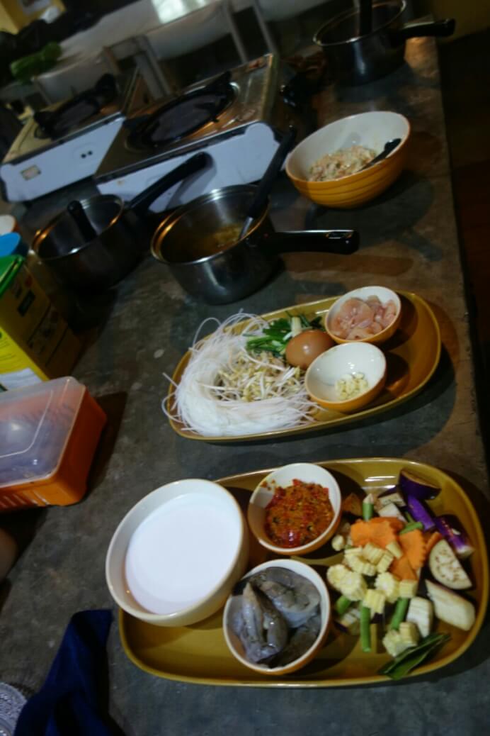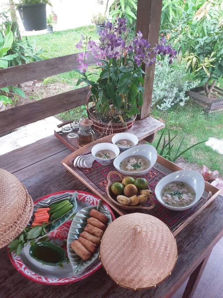 Après une nuit de 13h, petit déjeuner royal dans le kiosque de la maison : petits nems et raviolis de crevettes.