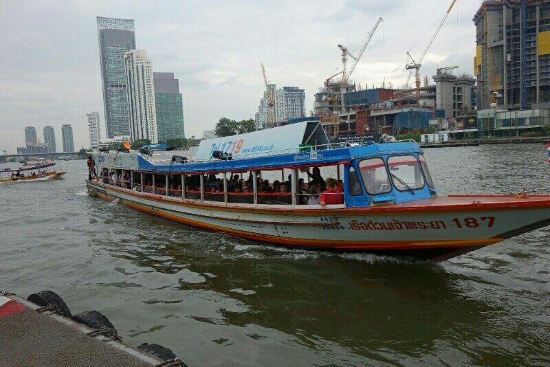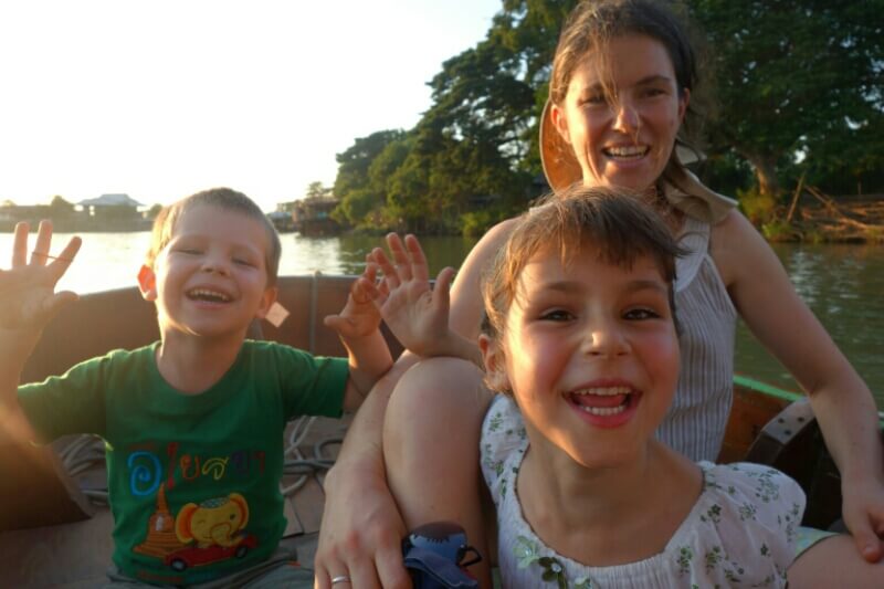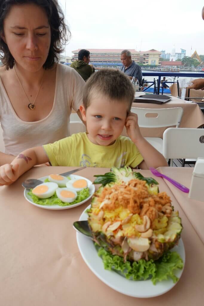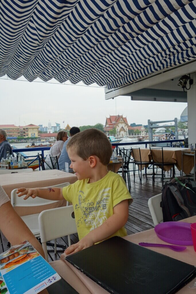 Retour chez mama dans la navette. On a pu être devant, et le trajet à ressemblé à une croisière sur le fleuve avec de belles vues sur les différents temples le long du fleuve. Le chauffeur essayait d’avoir des sourires de Louise et hugo. Les thaïlandais sont hyper prévenant envers les enfants et nous laissent un place assise régulièrement ou essayent d’attirer leur attention.