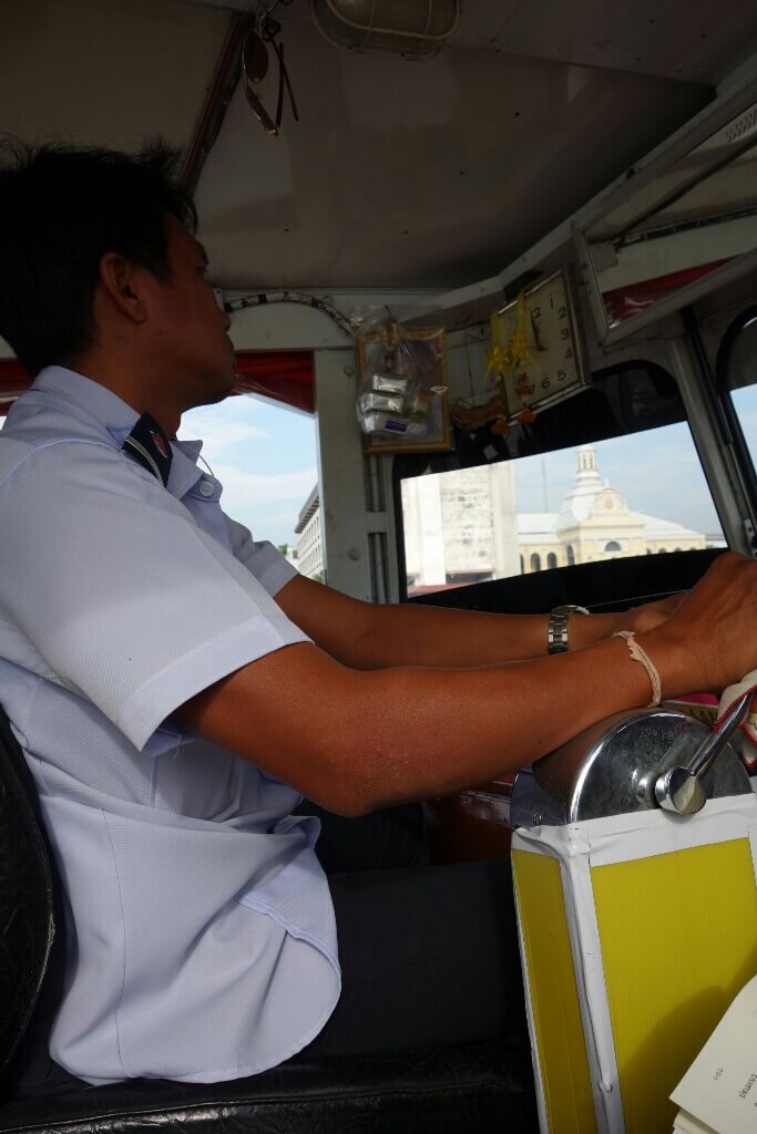 3h de bus plus tard, retour à Bangkok. correspondance avec le terminal de bus Nord en bts (métro aérien) et bus bien vieux sans porte avec ventilateurs au plafond.