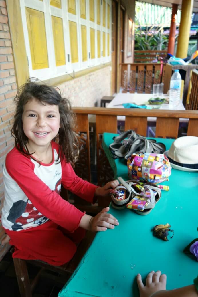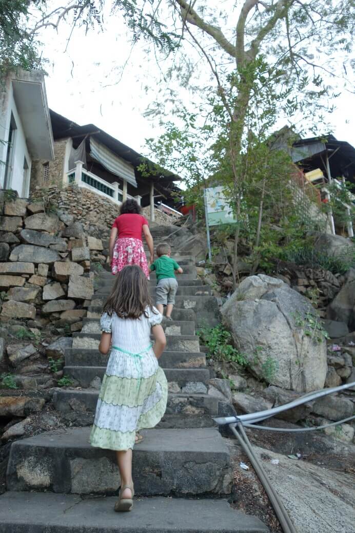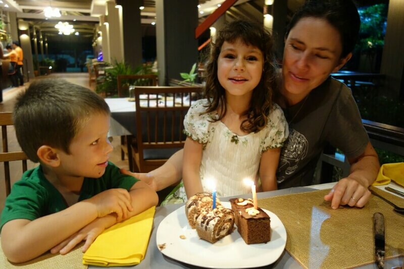 La 2eme nuit a été encore plus dure. en plus du lit inconfortable, du bruit des bars et de la galère d’ajustement de la moustiquaire, Louise à eu une mini diarrhée . Facile dans il faut re-défaire 5fois dans la nuit la moustiquaire, couvrir aux toilettes à 15m sans se faire une cheville sur les cailloux batailler contre les moustiques. Et pour couronner le tout, elle a récupéré le rhume de son frère et a commencé à tousser…