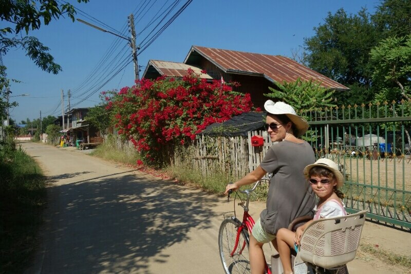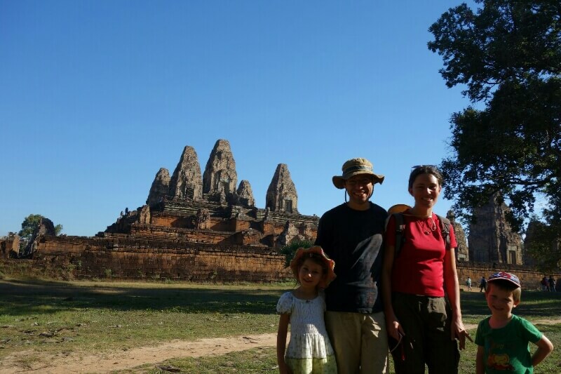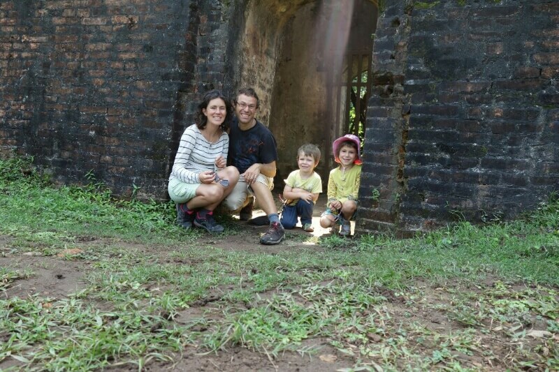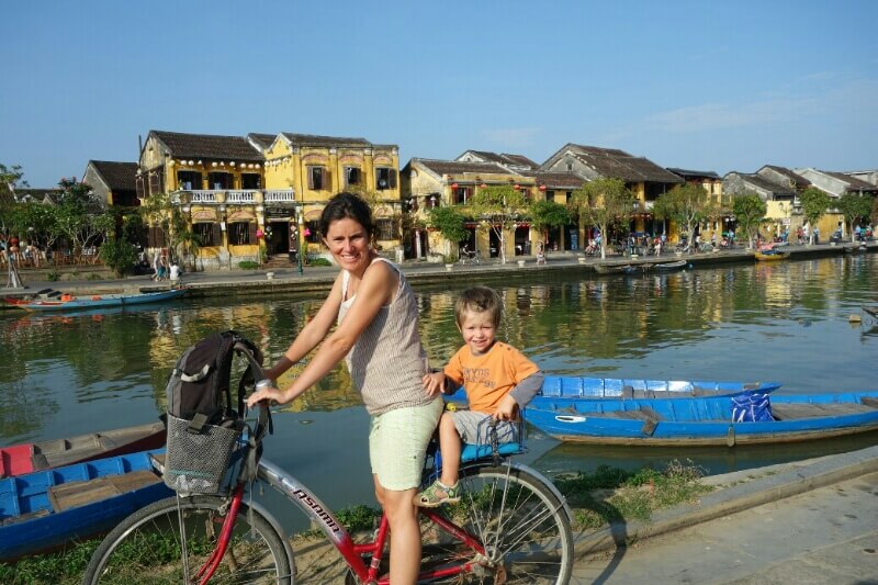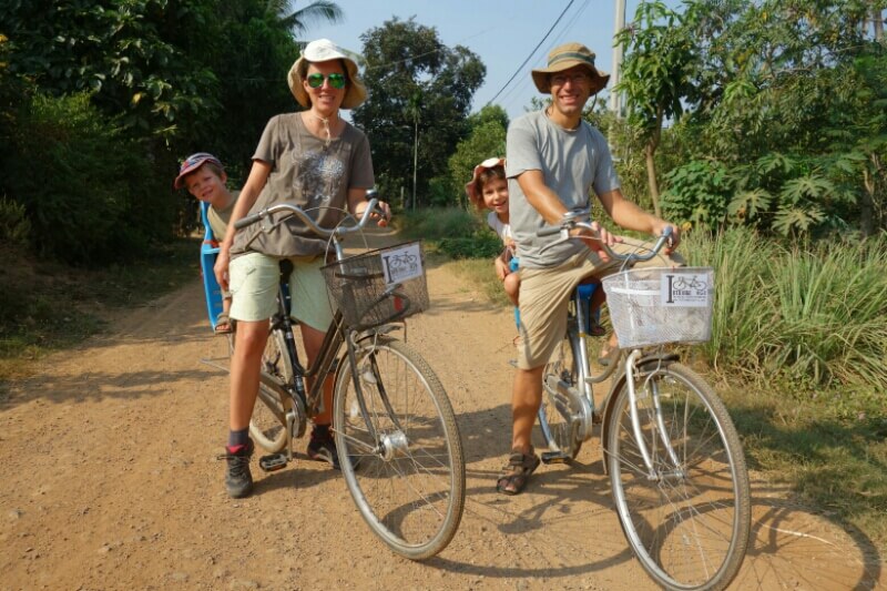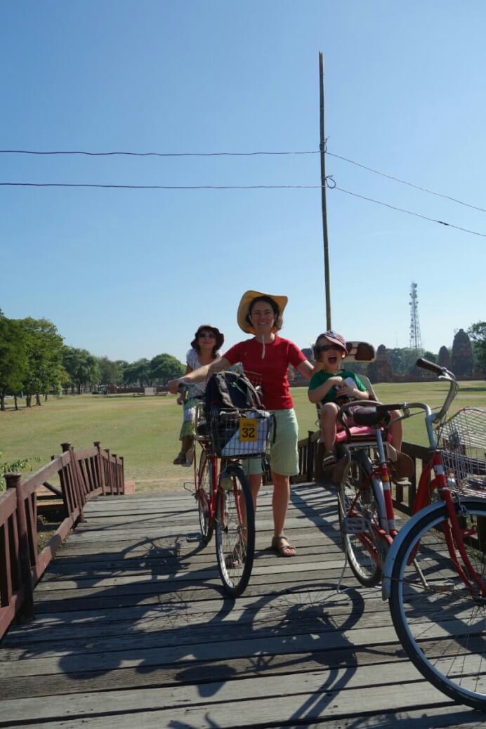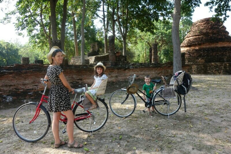 On a trouvé quelques vélos avec des sièges enfants. Après être sortis de la circulation, on entre dans de grands parcs qui entourent les sites de temples historiques en plus ou moins bon état.