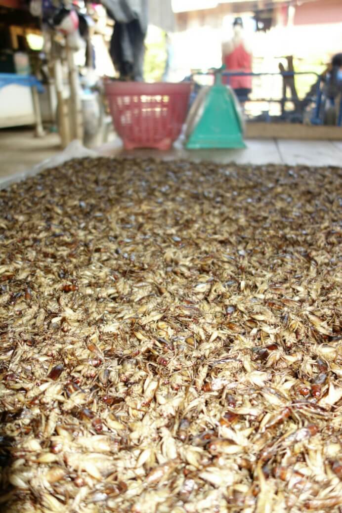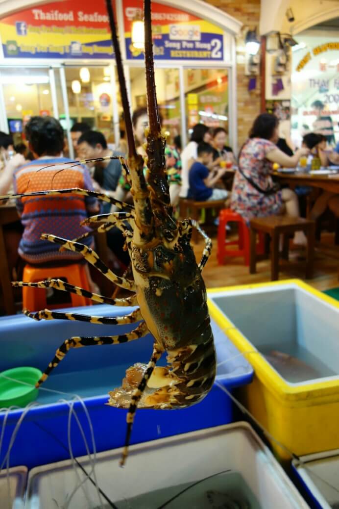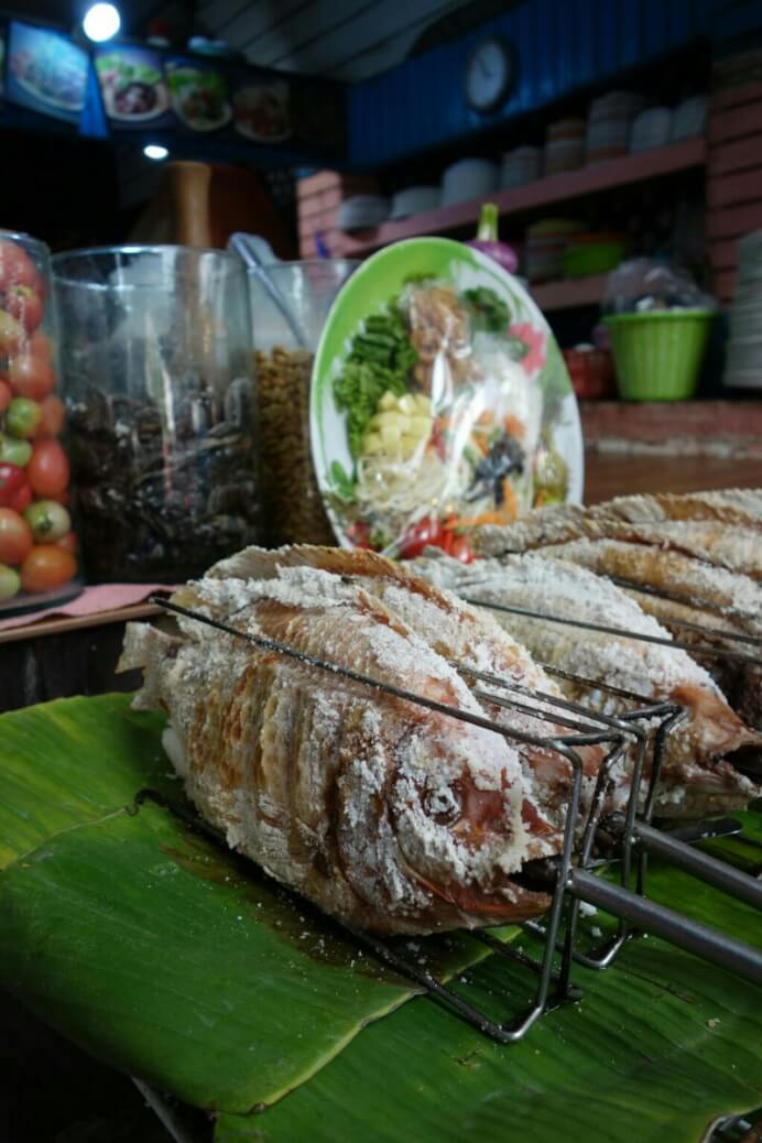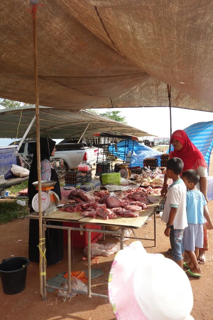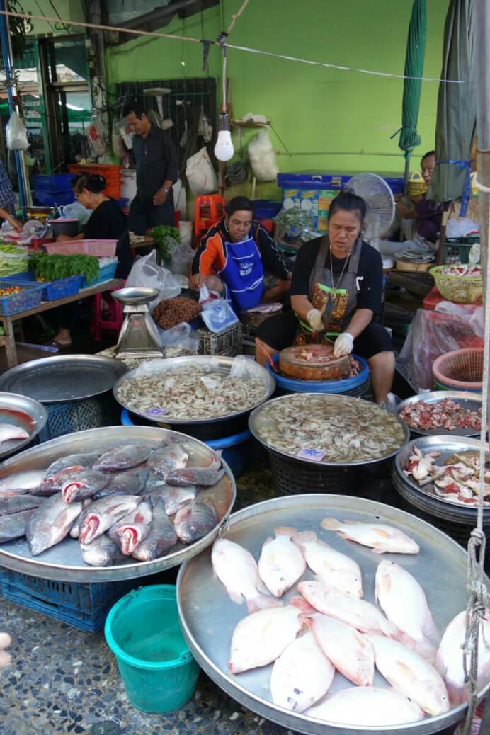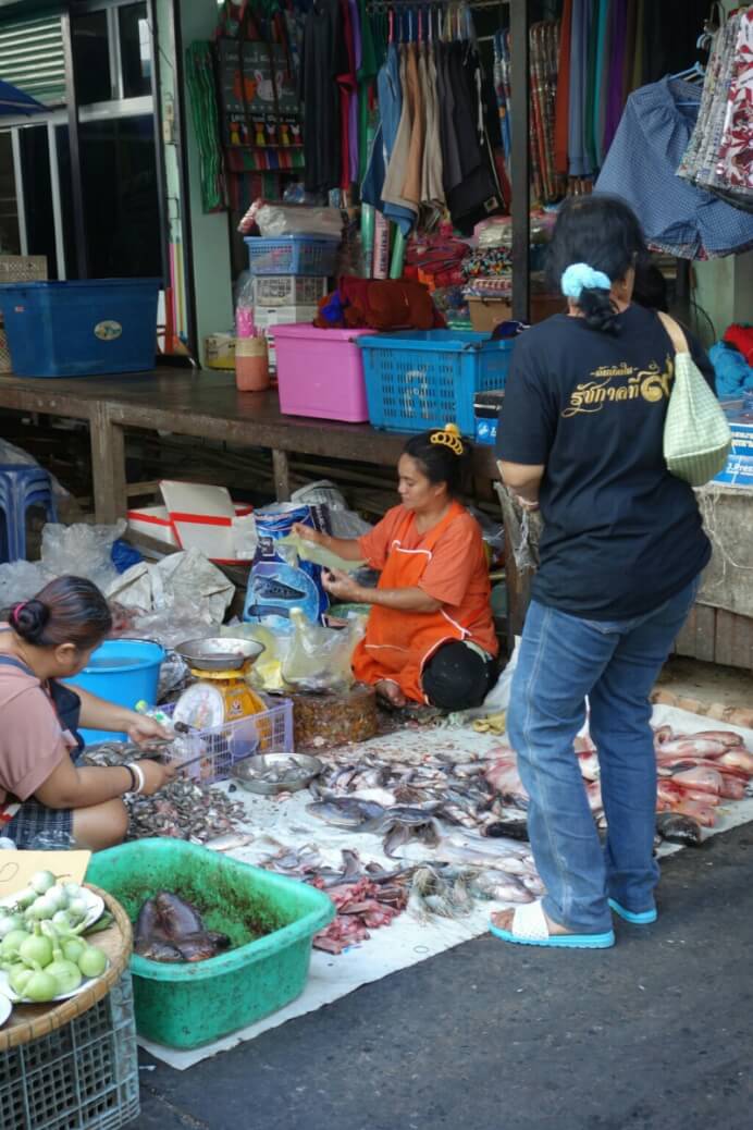Au retour, on tombe sur le centre commercial (comme indiqué dans le guide lonely planet ) qui est plutôt un énorme marché. Pour le coup, c’est vraiment un marché Thaï. Les poissons (des fois vivants) à même le sol (et l’odeur qui va avec quand il fait 35° à l’ombre )