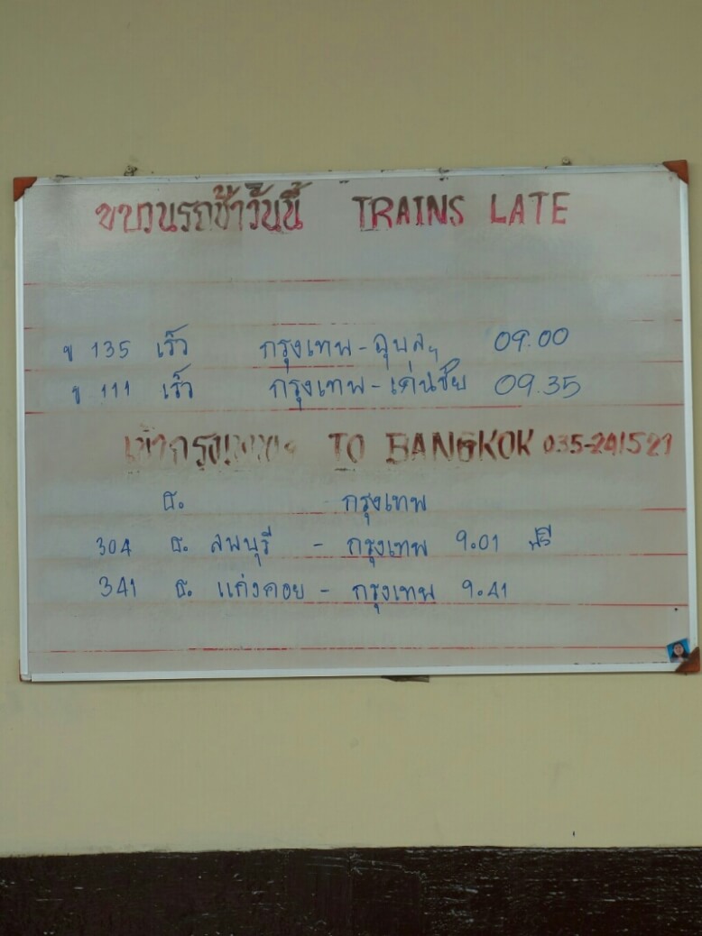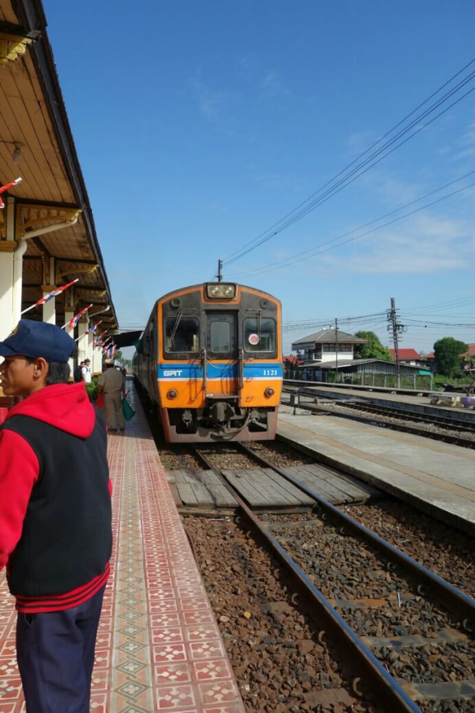 Aujourd’hui lundi, journée plus tranquille. On va à la gare acheter un billet pour le lendemain matin. Il y a 4 types de trains. Le normal, le rapide et l’express. Entre 4 et 8h pour la même destination : Phitsanulok. On prend un billet dans le rapide en 3eme classe (on vous dira ce que ça a donné. .)