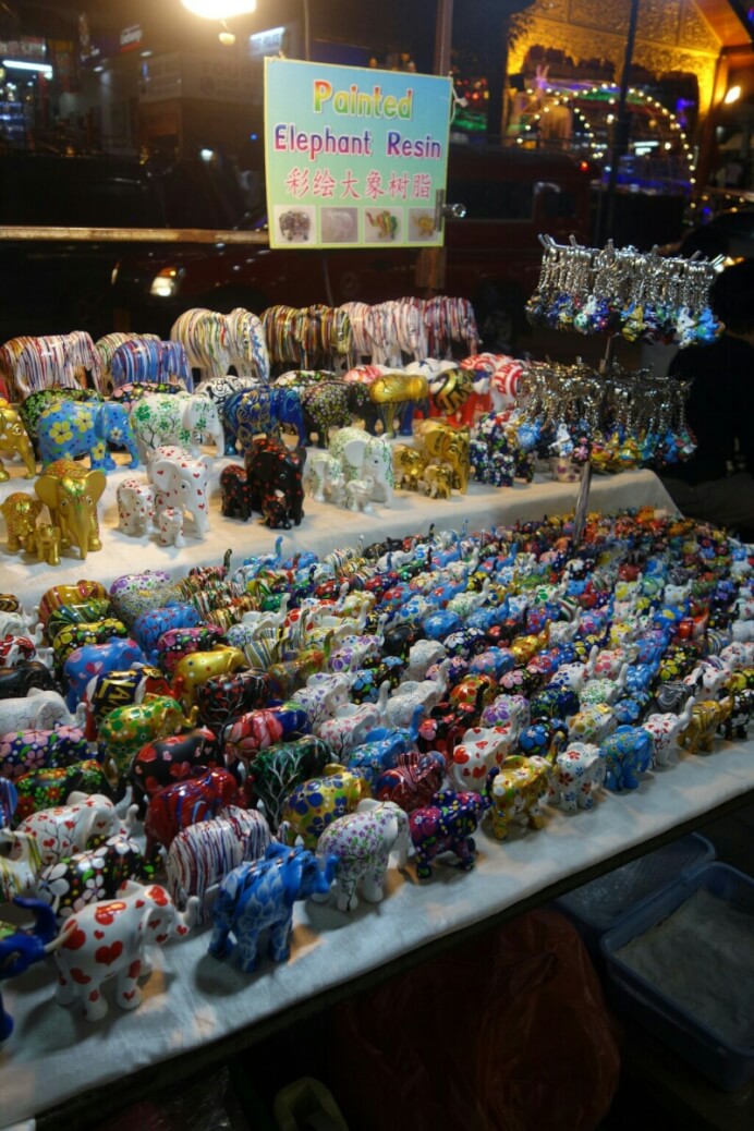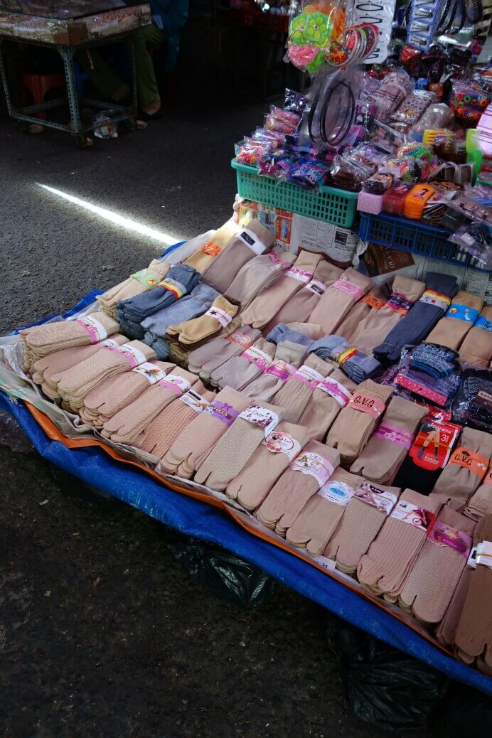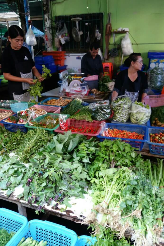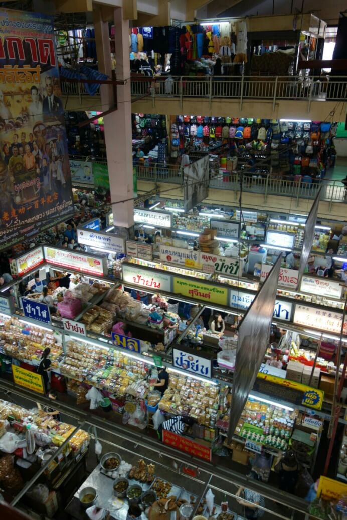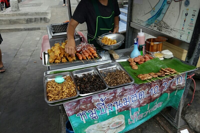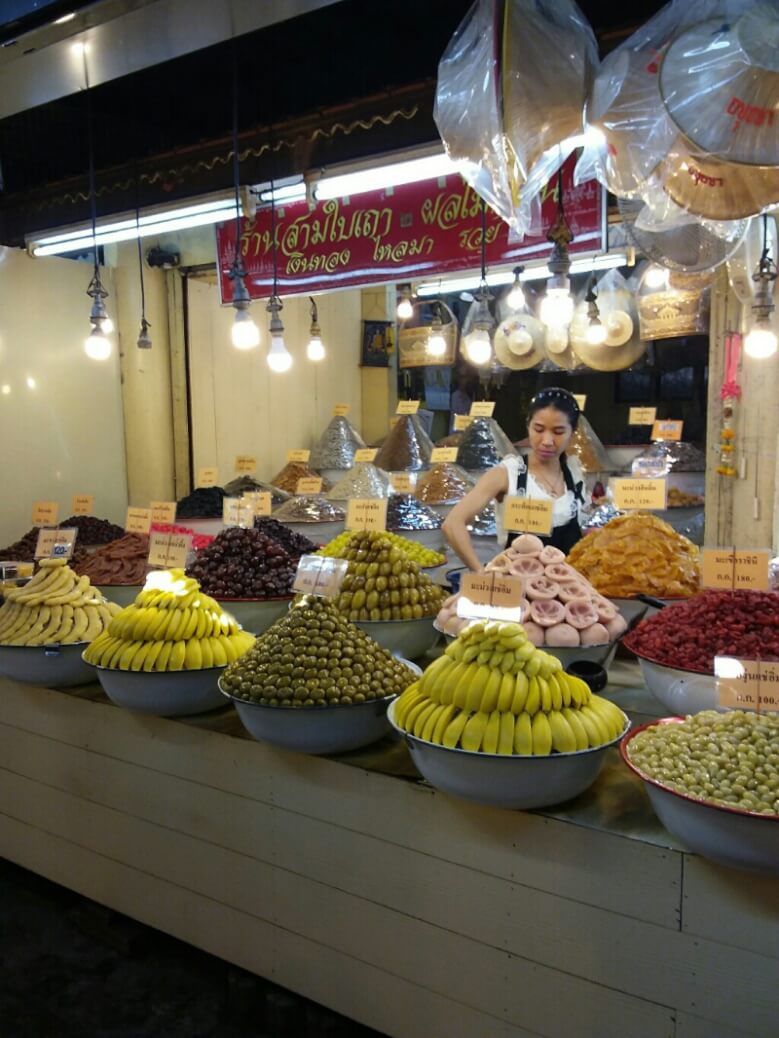 Des légumes, fruits (à des vrais prix locaux, 20bt pour 20 bananes (70cts) , des jeux pour enfants, des porte-bonheurs, des tickets de loterie. Il y a évidemment aussi les brochettes grillées et autre nourriture de rue. Des associations sont parfois improbables. Par exemple une pharmacie vendait aussi des œufs..