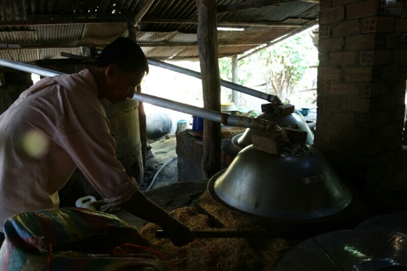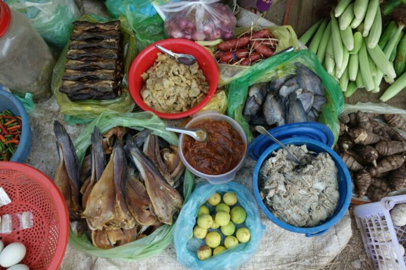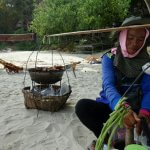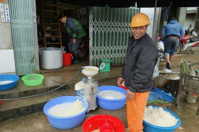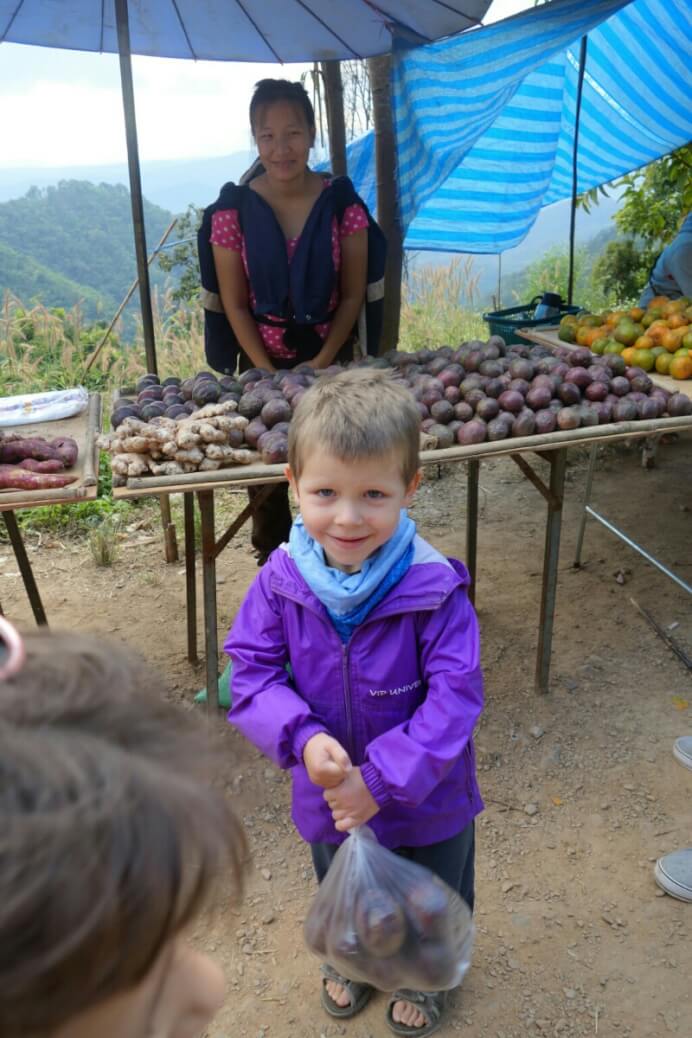 On commence par un autre marché à 15km, et sans touristes. Un peu plus petit mais beaucoup plus humain et les gens sont curieux de nous voir. On se fait offrir des brochettes de … viande (sûrement du cochon noir, sûrement, mais surtout excellent) Avec deux ou 3 verres d’alcool de riz.