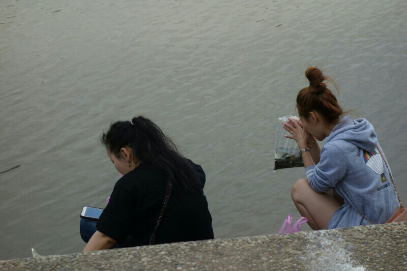 Beaucoup de pêcheurs s’agglutinent le long des ponts pour pêcher ce qui ressemble à des sardines.