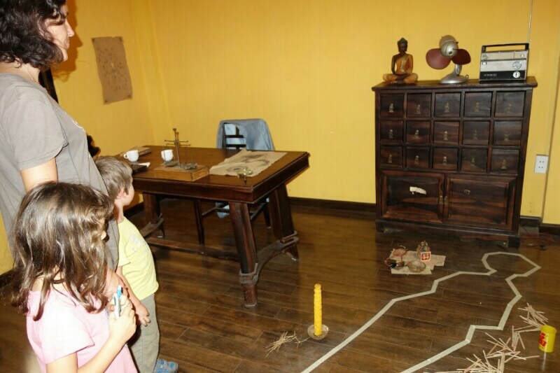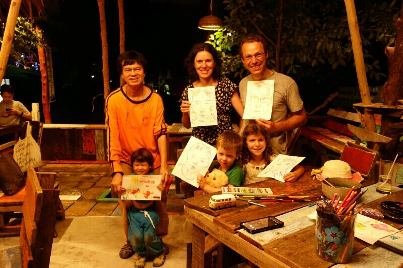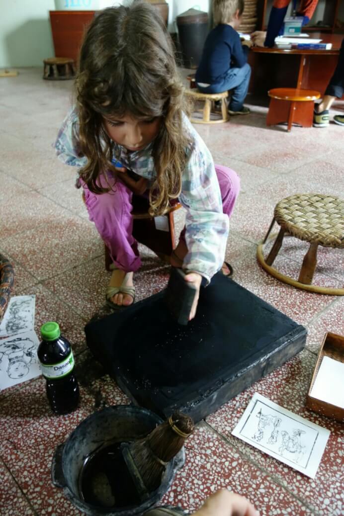 Au fond d’un couloir, on trouve un espace découverte génial. Les enfants font des illustrations grâce à des tampons de bambou, on apprend un nouveau jeu typique : ô an quan, et on utilise divers accessoires