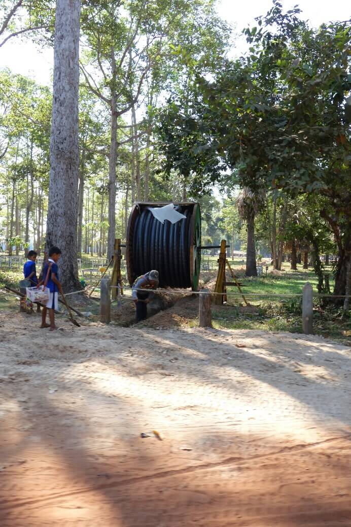 Et voici un employé de la compagnie électrique avec son matériel de pro en bambou en train d’installer un nouveau câble. Pas sur qu’il sache lesquels sont encore utilisés..