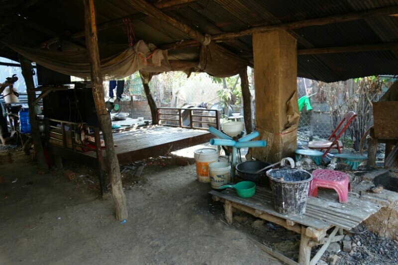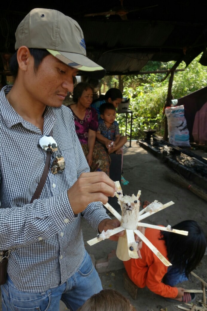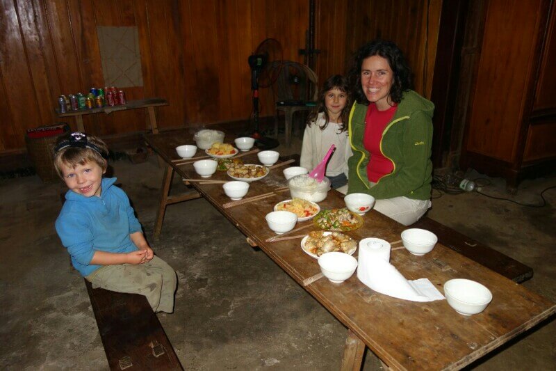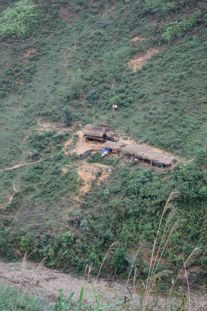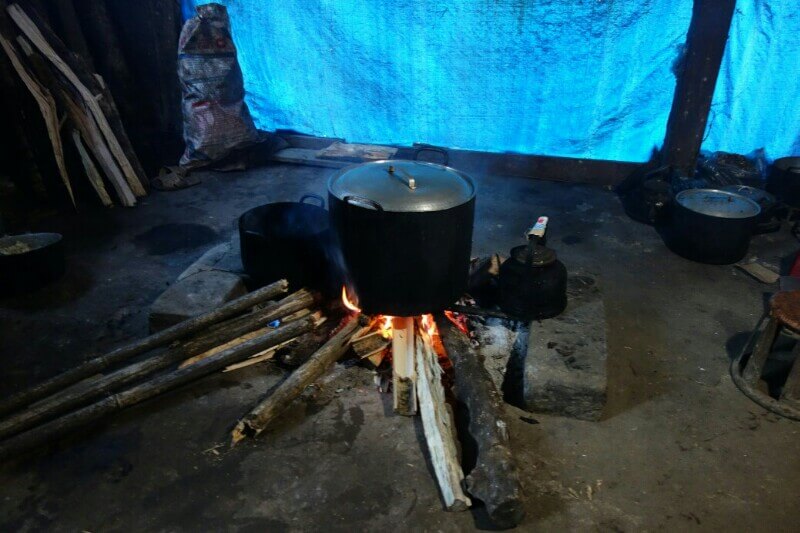 Vers midi, on s’arrête dans une famille par hasard, juste parce qu’un gamin nous fait un signe. On entre dans cette maison typique d’une grande pièce. La famille est réunie autour du feu. 1 min après notre arrivée, les voisins débarquent intrigués avec 3 morceaux de bois. On se retrouve à 15 autour du petit foyer à se regarder mutuellement. La maison est très sommaire. Pas d’électricité, un petit plancher, 2 paillasses, quelques habits délavés. Des reste de cochons sont suspendus au dessus du feu pour les fumer. On partage notre pique nique avec eux et bien sûr le thé (heureusement l’obscurité ne permettait pas de voir l’état de la tasse).