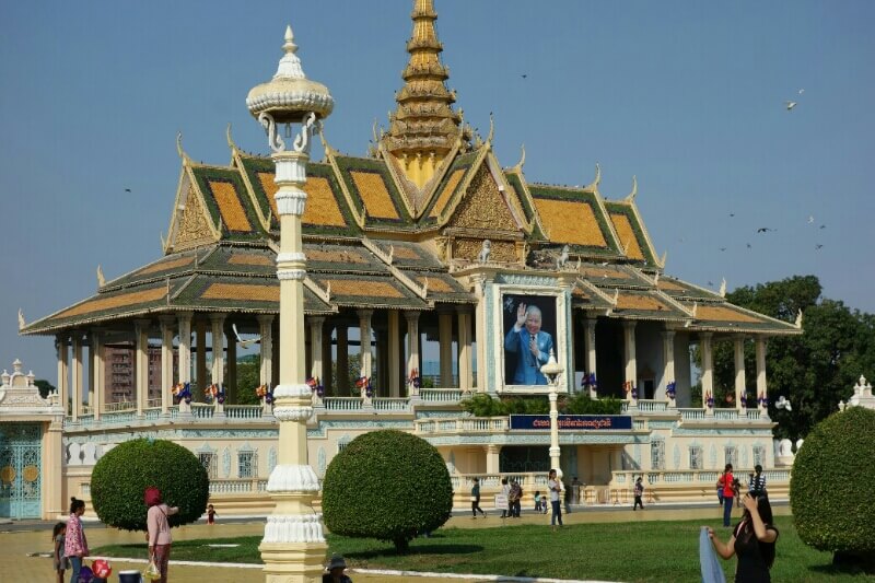 On prend le bac (4bath/personnes, même les enfants, ils font plus de 90 cm..), puis l’express (14/personnes ce coup ci pas les enfants . .). On accoste à 2 pas du grand palai. Beaucoup de touristes , majorité de chinois , viennent aujourd’hui le visiter . je dois mettre un pantalon par respect pour le roi alors que mon bermuda descend en dessous des genoux. Marion avec sa tenue légèrement transparente et largement au dessus des genoux n’a besoin de rien mettre de plus. à 30° à l’ombre c’est injuste !