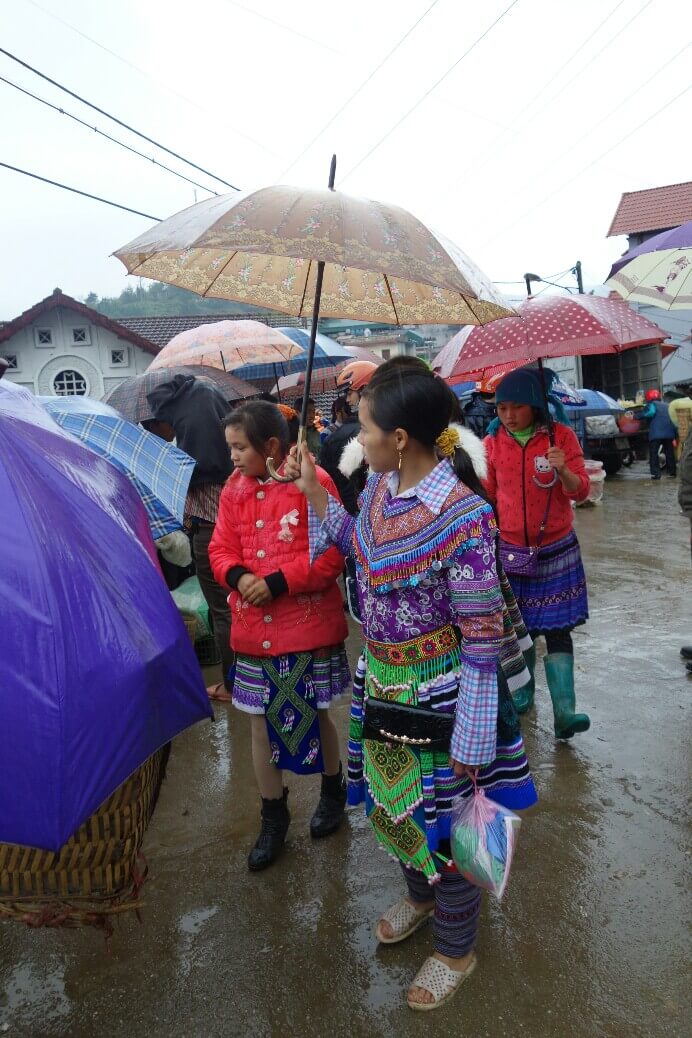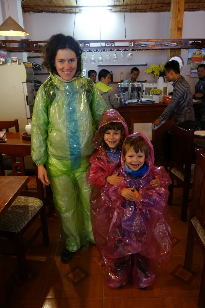 Mardi, l’arrivée en bus à Sapa est très maussade. On ne voit pas à 5m tellement le brouillard est épais, et il se dissipe, il tombe un belle averse ! Mais on y croit, on réserve un trek de 3 jours, allégé pour que ça soit accessible aux enfants.