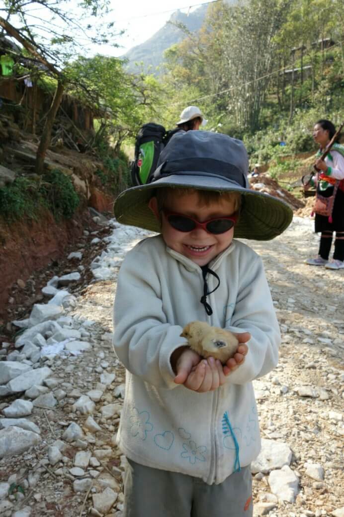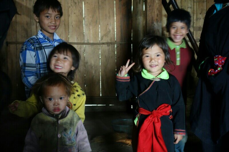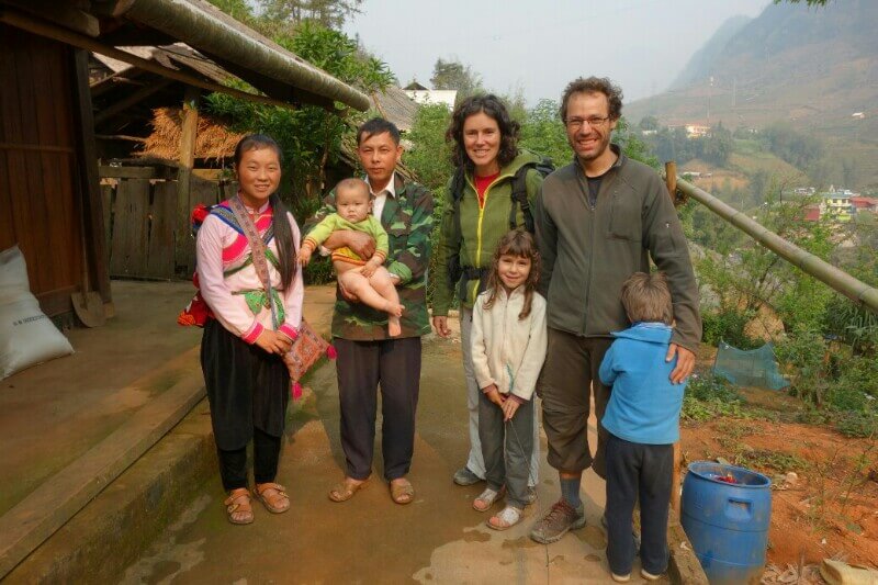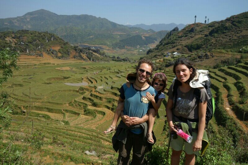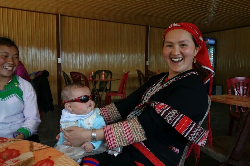 Le premier jour, on part en direction de l’ethnie des Dzao rouges, reconnaissables à leur coiffe. Notre guide , à gauche sur la photo, avec son bébé de 4 mois, fait partie de la minorité des Hmong noirs.